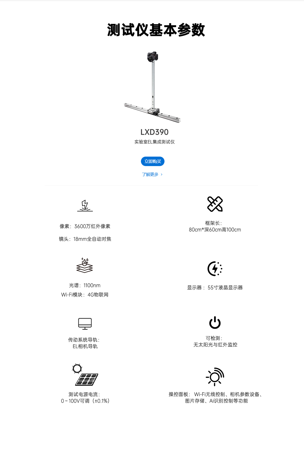 萊科斯(LAILX)致力于光伏檢測設(shè)備的研發(fā)與生產(chǎn),現(xiàn)有設(shè)備包括 EL檢測系列,便攜式EL檢測儀,組串式EL檢測儀,太陽能便攜式EL測試儀,IV功率測試系列,便攜式IV測試儀,電能質(zhì)量分析儀,等相關(guān)光伏電站檢測設(shè)備與光伏產(chǎn)線實驗室檢測設(shè)備。