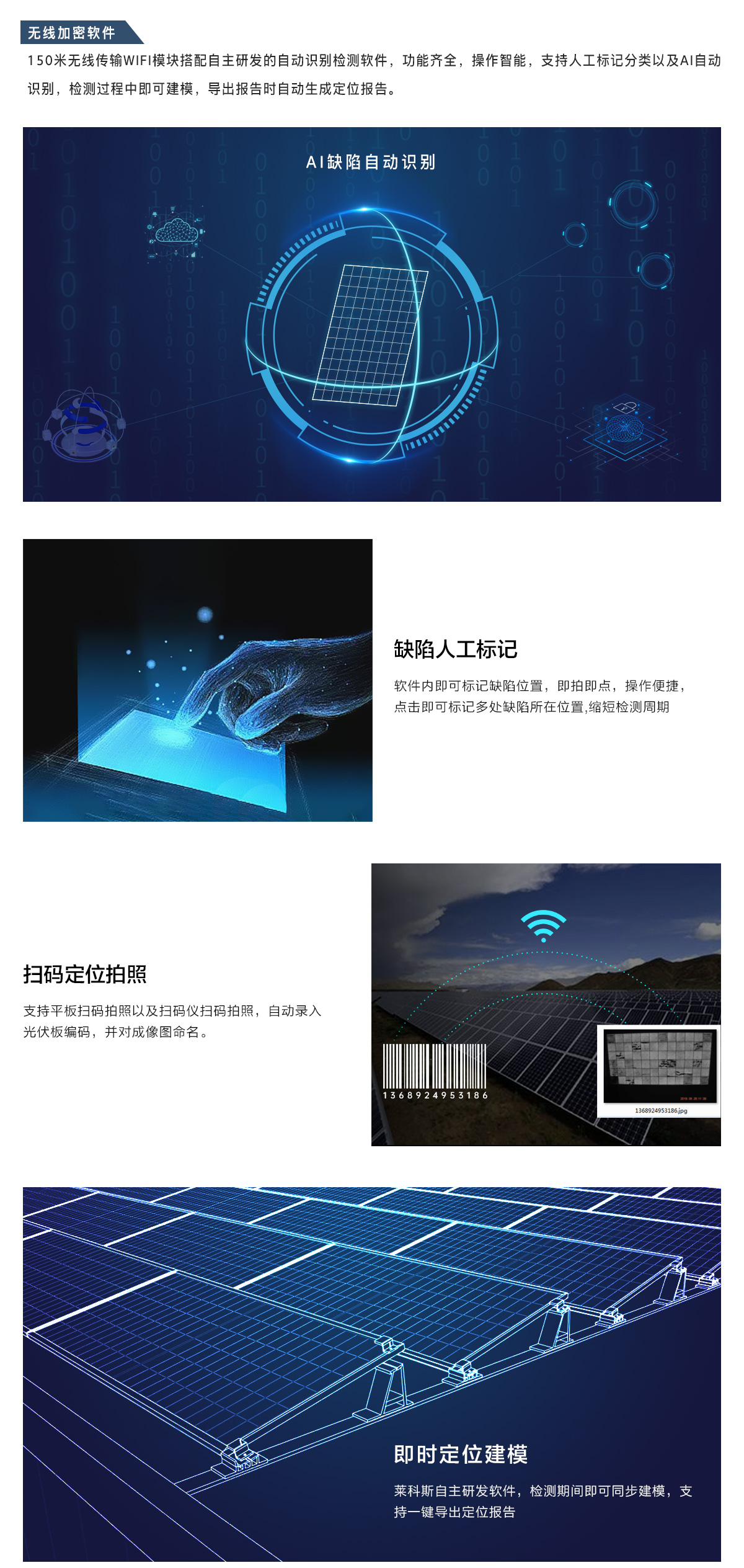 萊科斯(LAILX)致力于光伏檢測(cè)設(shè)備的研發(fā)與生產(chǎn),現(xiàn)有設(shè)備包括 EL檢測(cè)系列,便攜式EL檢測(cè)儀,組串式EL檢測(cè)儀,無(wú)人機(jī)EL測(cè)試儀,IV功率測(cè)試系列,便攜式IV測(cè)試儀,電能質(zhì)量分析儀,等相關(guān)光伏電站檢測(cè)設(shè)備與光伏產(chǎn)線實(shí)驗(yàn)室檢測(cè)設(shè)備。