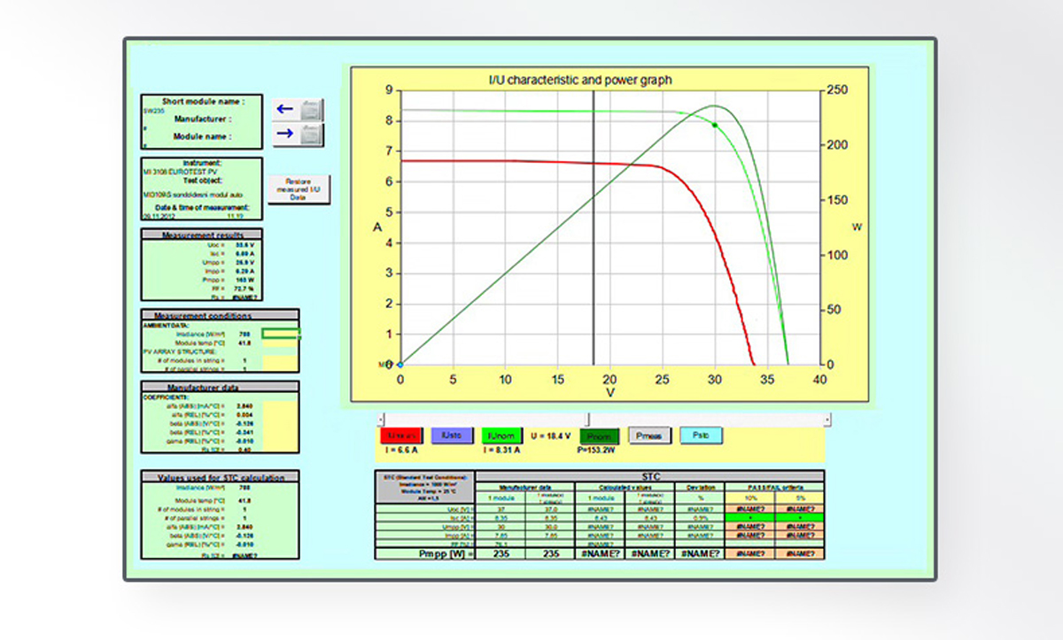 電壓、電流、功率、電性能;開路電壓(Ucc)、短路電流(Isc);光伏模塊和陣列的I/V曲線;光照度;模塊溫度