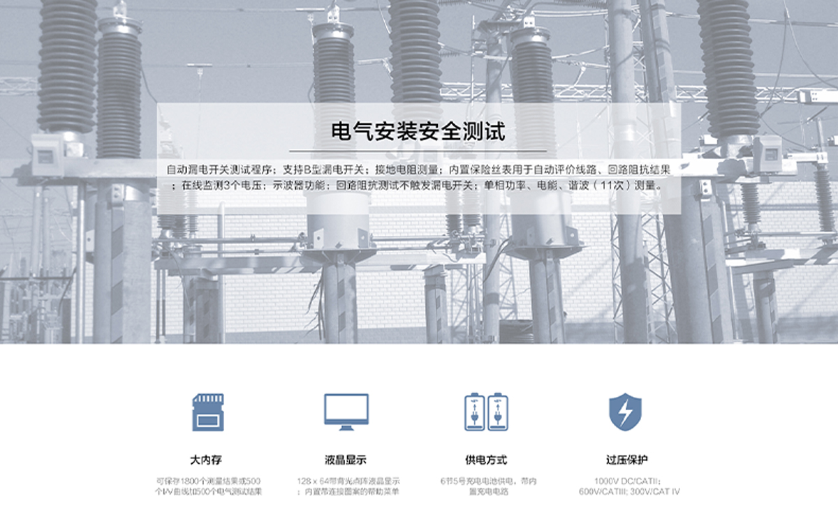 絕緣電阻;PE導線連續性;線路阻抗;回路阻抗(不觸發漏電開關);RCD漏電開關測試(AC、A、B型);接地電阻測試;交流電流測試(負載電流或泄漏電流);電壓、頻率、相序測試;功率、電能、諧波測試。
