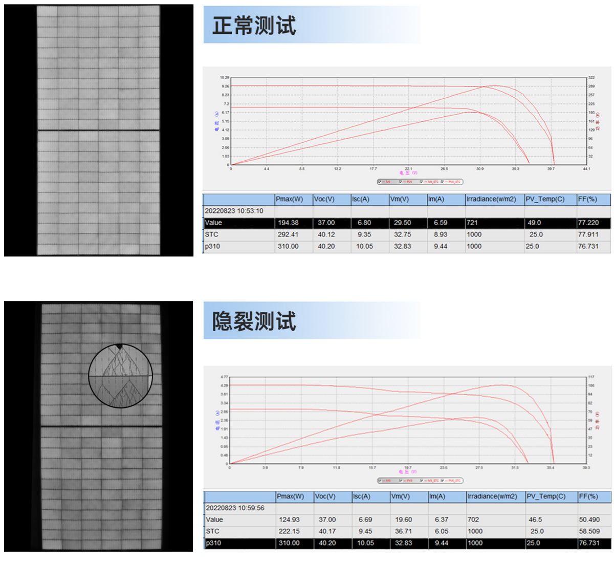 - 光伏電池板破?貫穿整個電池?,但通過伏安特性測試,在如圖分析軟件中看到,開路電壓和短路電流損失分別為10.9%和53.7%,但測試曲線出現(xiàn)出現(xiàn)明顯改變,功率損失分別達到67.8%和STC-63.5%。便攜式IV測試儀可更好的輔助EL檢測從?判定組件是否可繼續(xù)使?。